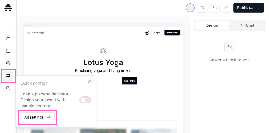 After migrating your legacy site, you may want to explore a different template or update your site’s design. To do this, go to the left panel icons menu and click on Settings, then select All settings