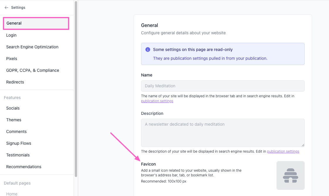 - Your website settings will open on the General tab. In your general settings, scroll down to Favicon.