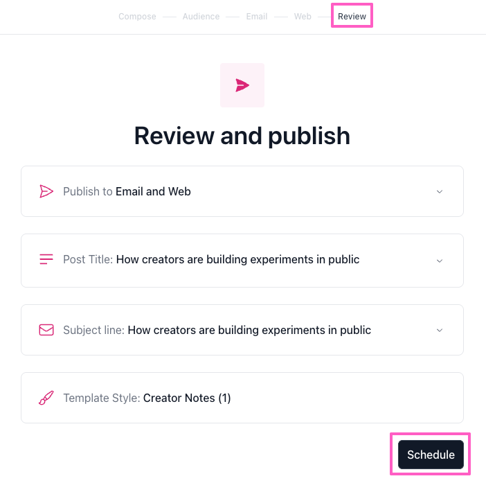 - When done drafting the post, go to the Review page and click Schedule.