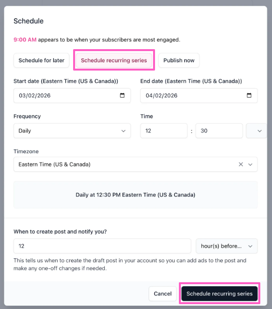 - Review your settings and click Schedule recurring series at the bottom to activate it.
