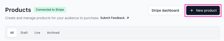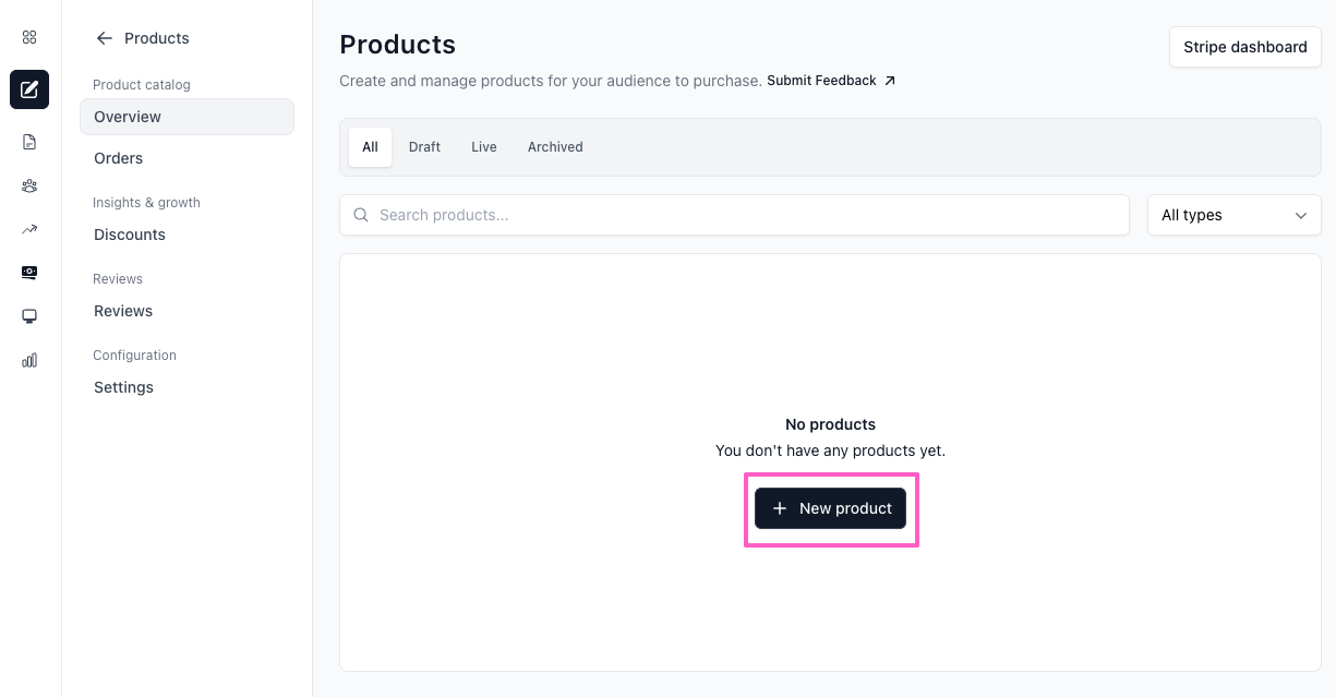 - Click on the + New product button. If you’ve never created a digital product before, this button will appear where your product list normally displays.
