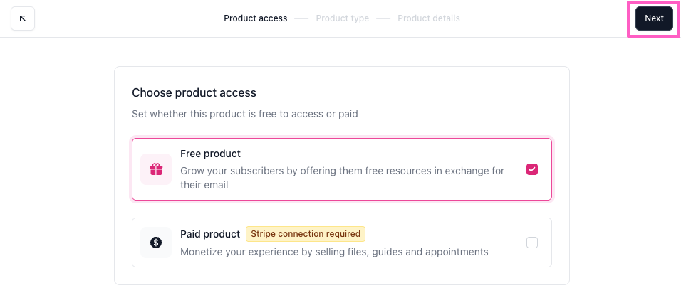If you already have products, the + New product button will appear at the top of the page. - On the Product access screen, select Free product, then click Next.