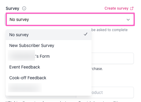 To attach a survey, you’ll need to have already created a survey in your account. While creating your free product, select a survey from the Survey dropdown in the product details form. This will add the survey as a step in the checkout flow before the user receives the product.