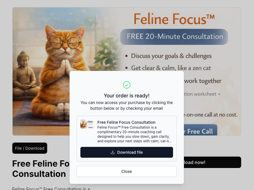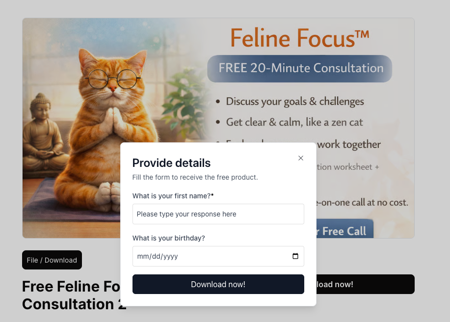 Because no purchase is involved, free products don’t require a Stripe account. Instead, visitors provide their email address to claim the product, and the order is recorded in your dashboard for tracking. All product formats available for paid digital products — including link/media, file/download, and coaching/1:1 sessions — can also be offered as free products.