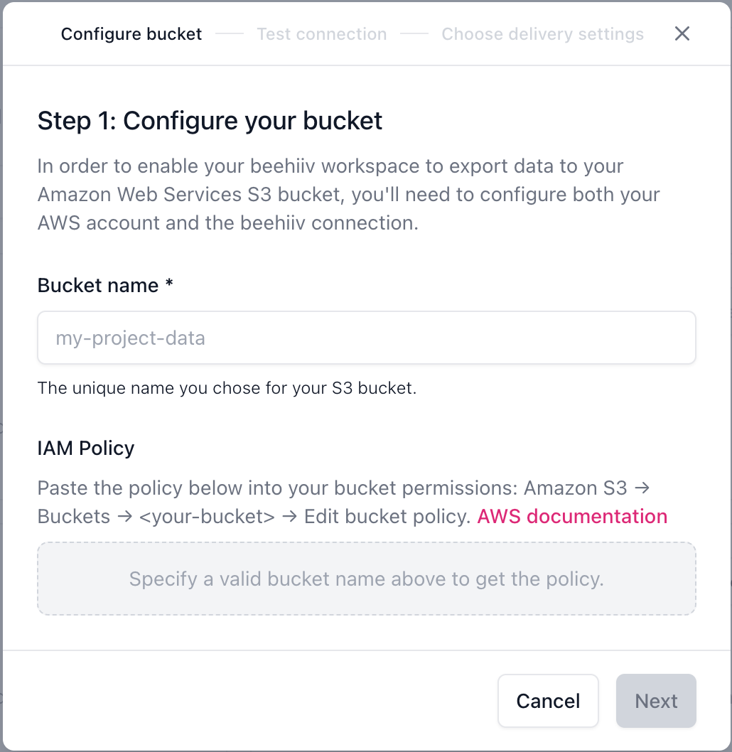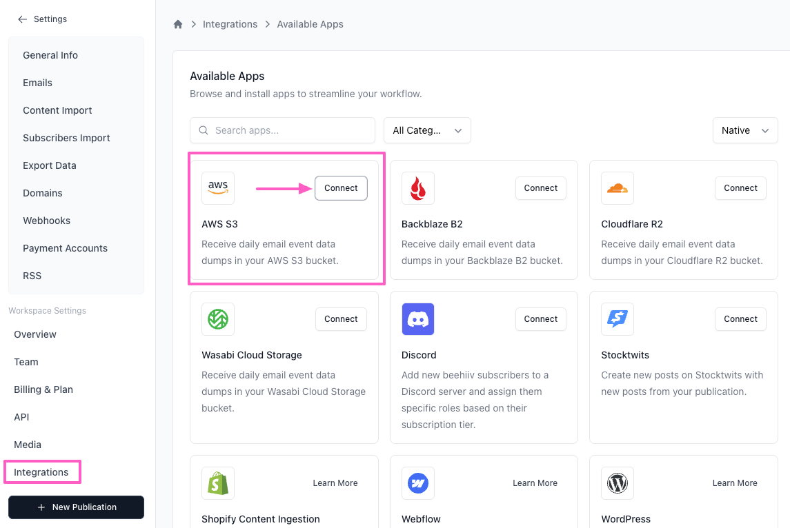 The beehiiv S3 integration lets you export subscriber interaction data, including email clicks, opens, and bounces, directly to your own cloud storage bucket for ingestion into an external database or analytics platform.