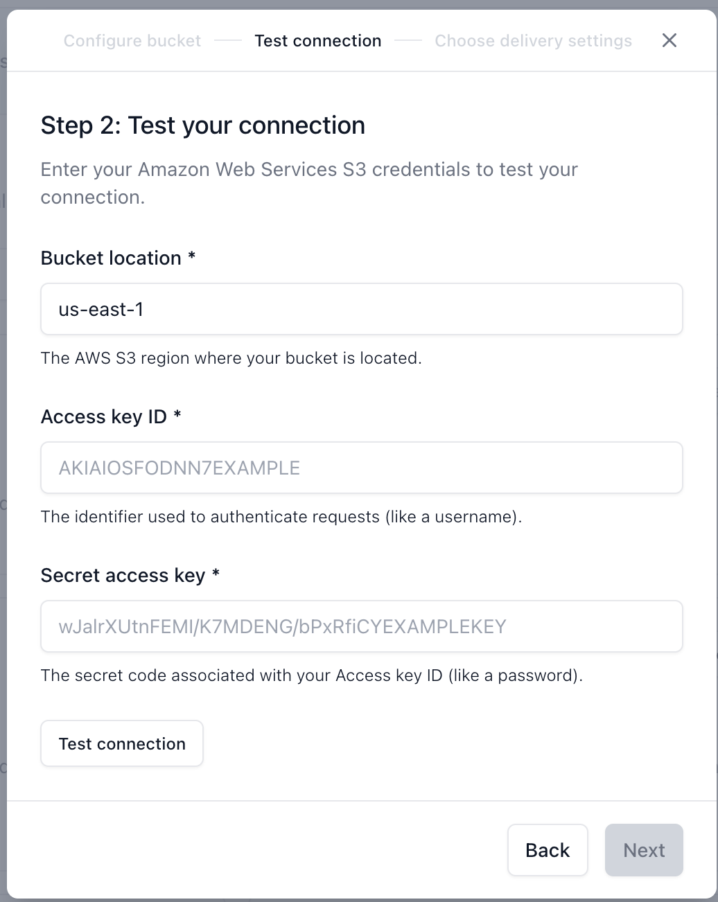 Once entered, the IAM Policy field below will populate with a JSON object showing the access policy required to access your bucket. Copy this policy and apply it to your bucket permissions before proceeding. When ready, click Next. - In the Test your connection step, enter your bucket's region and the credentials used to access it. When done, click Next.