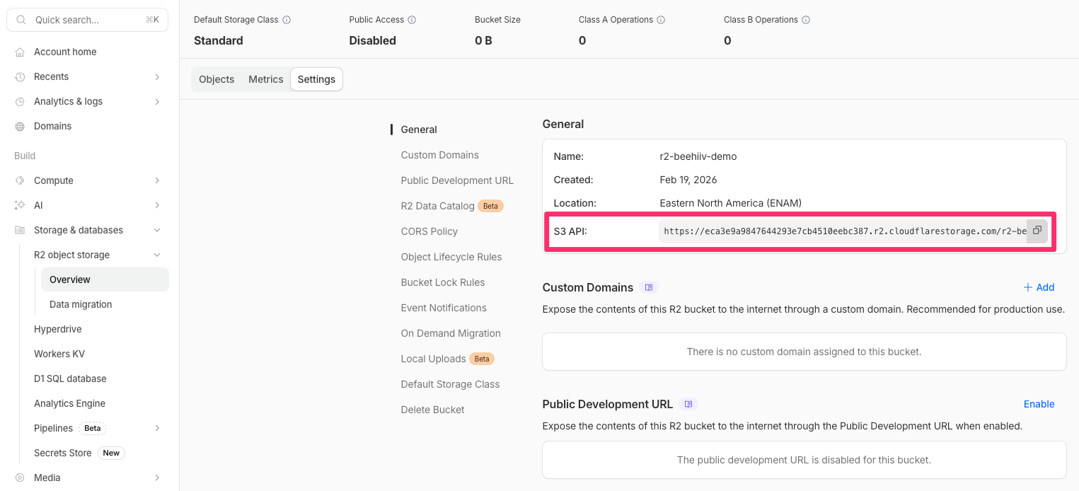 Bucket URL: Navigate to your R2 bucket and click Settings. The bucket URL appears under the General section, labeled S3 API.