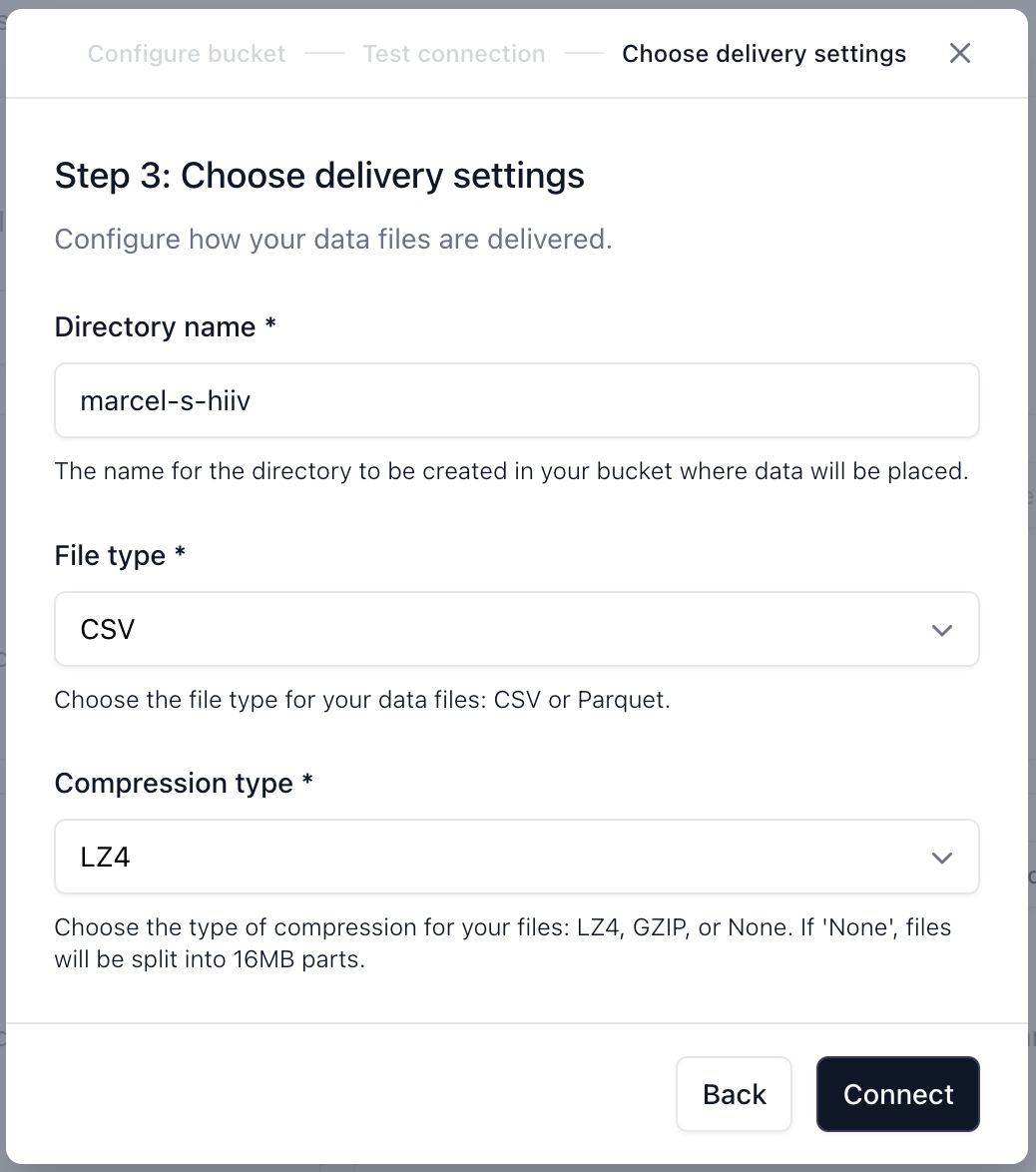 - On the final screen, configure your delivery settings. Specify a directory name, file type, and compression type, then click Connect.