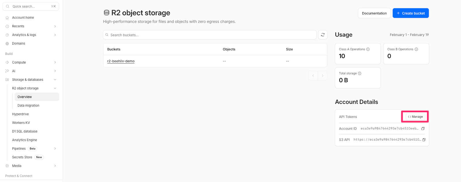 API credentials: The API credentials will need to be generated on the R2 Overview page. Once there, find Account Details on the right side and then on the click Manage next to API Tokens.
