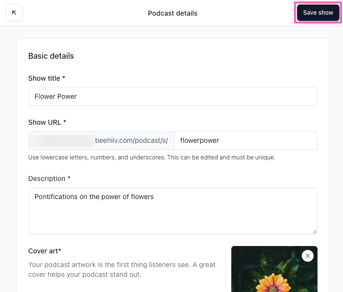 - Show URL: Enter the URL for your show using lowercase letters, numbers, and underscores. This must be unique and can be edited later.