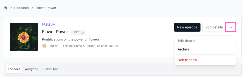 - You'll return to your Podcasts dashboard where your new show will be listed. Click the arrow next to Edit details to access additional options: Edit details, Archive, and Delete show.