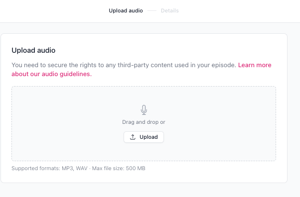 - You’ll be prompted to upload an audio file in MP3 or WAV format (500 MB max file size).
