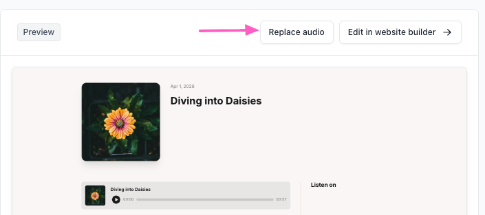 - (Optional) On the Preview panel, you can select Replace audio to swap the current file, or Edit in website builder to customize the Podcast page (updates are applied to all podcast episodes).