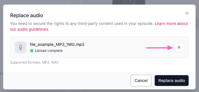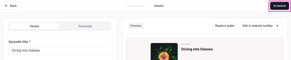 If replacing audio, click the X next to the current file, upload a new one, and click Replace audio. - When your episode is ready, click Schedule in the top right corner.