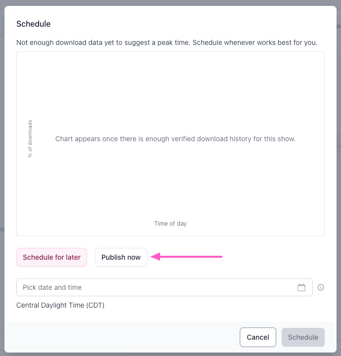 Schedule for later: Click the calendar icon and select a future date and time for the episode to publish automatically, then click Schedule.