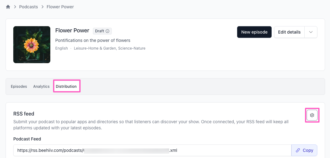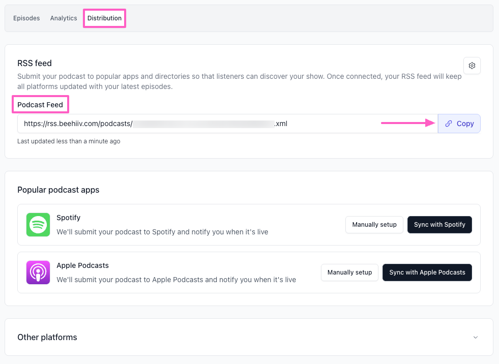- Copy your RSS feed URL from the Distribution tab.