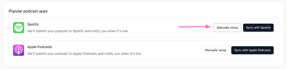 Spotify for Podcasters is a free platform where you can submit and manage your podcast on Spotify. Once your beehiiv RSS feed is live, you can submit it directly through their platform. beehiiv gives you two ways to connect: a quick sync directly from your dashboard, or a manual setup through Spotify for Podcasters.
