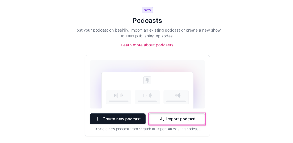 This article walks you through importing your podcast and setting up a redirect from your previous host. For information on creating a new podcast from scratch, see Creating a podcast on beehiiv.