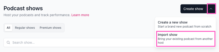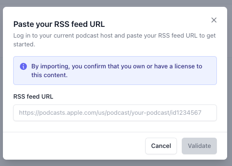 If you have a show set up, your Podcasts dashboard will open. In the top right corner, click the arrow next to Create show and then select Import show. - Paste your RSS feed URL from your current podcast host into the field and click Validate.