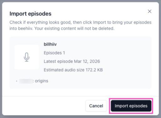 - The feed will be validated and a preview of your show will appear, including your title, artwork, and episode info. Confirm the details look correct, then click Import episodes.