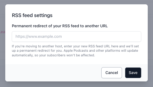 - Enter your new RSS feed URL in the field provided and click Save. A 301 redirect will be set up from your old RSS feed to your beehiiv feed.