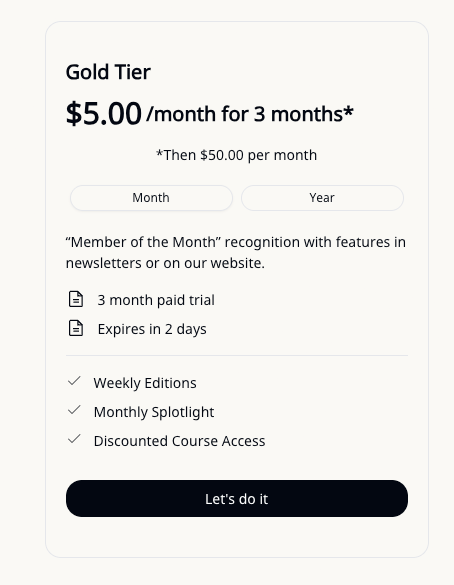 | Free Trial (previously labeled 'Trial') | Gives readers full access at no cost for a set period, then converts to the tier's standard price. | Low-friction onboarding when you want zero up-front cost. |