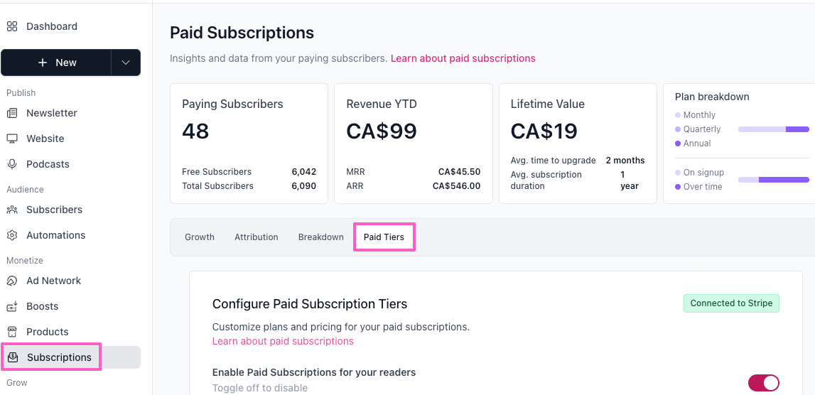 - Your Paid Subscriptions dashboard will open. Navigate to the Paid Tiers tab.