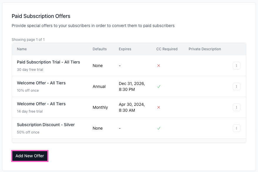 - Scroll down to the Paid Subscription Offers section and click Add New Offer.