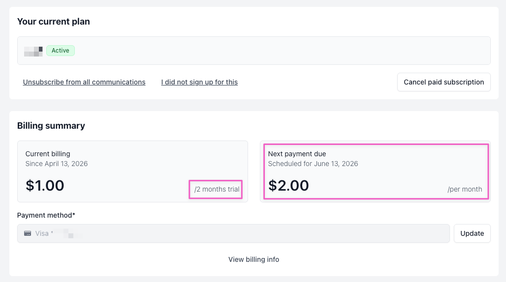 In the subscriber's account, the current payment will reflect the trial price and length. The next payment due section will show the date and amount of their first standard billing charge, so there are no surprises at renewal.