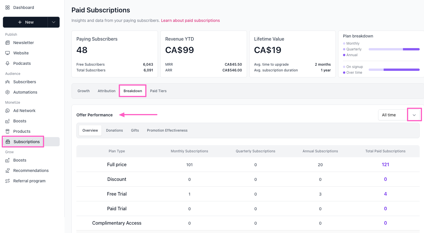 The Offer Performance table gives you a breakdown of how each offer type is converting, including paid trials, broken out separately from free trials and discounts. Paid trials are listed as their own plan type alongside Full Price, Discount, Free Trial, and Complimentary Access, so you can evaluate performance across each independently.