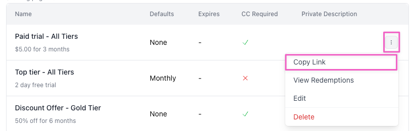 From the Paid Subscription Offers list, click the three dots menu next to the offer and select Copy Link. Paste the link into a new browsing window to view it as a subscriber would.