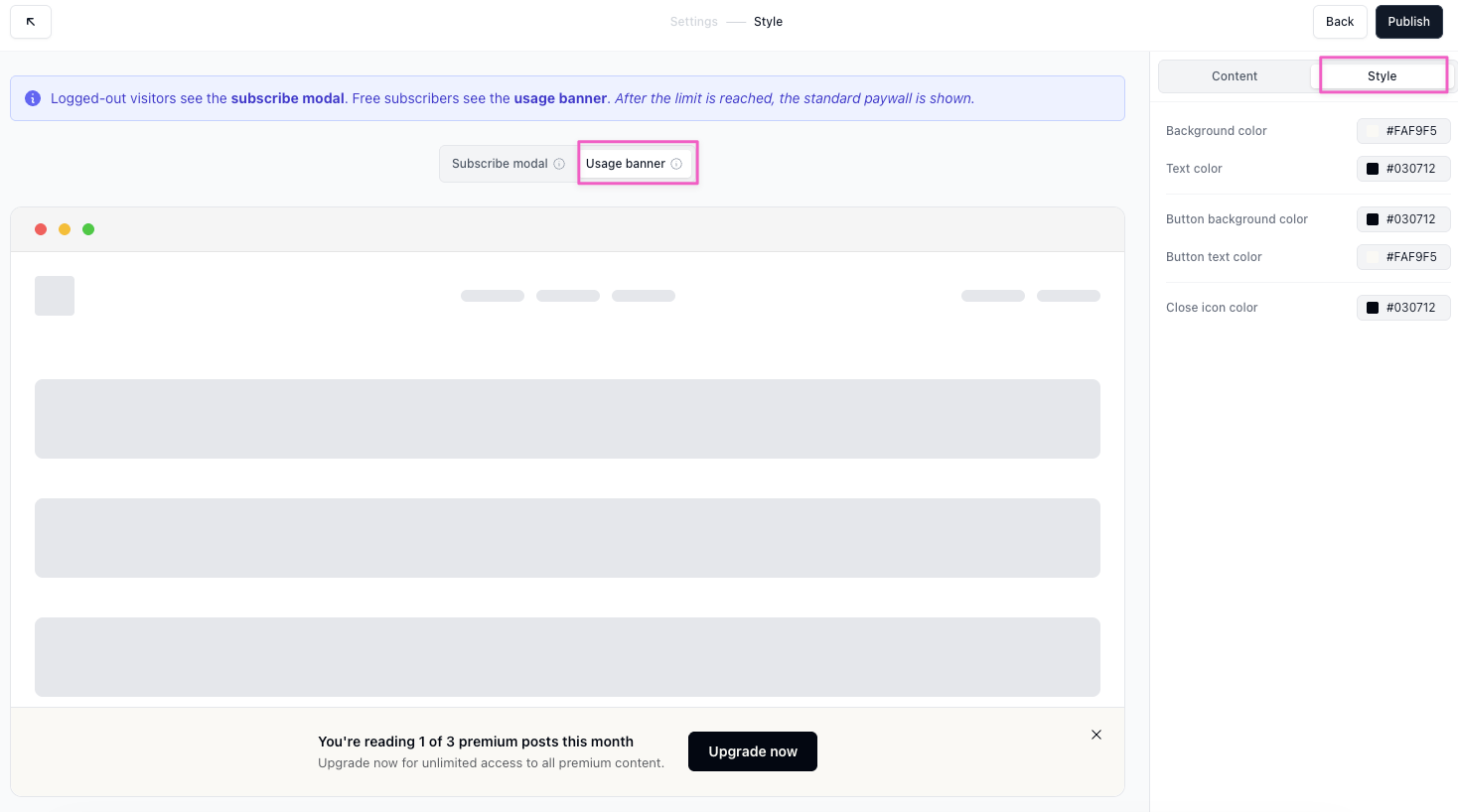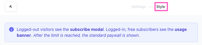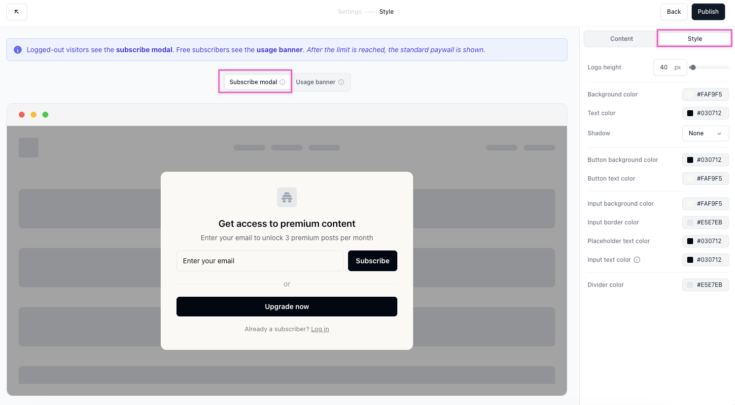 - The Style settings will open. Customize the subscribe modal and usage banner (see below).