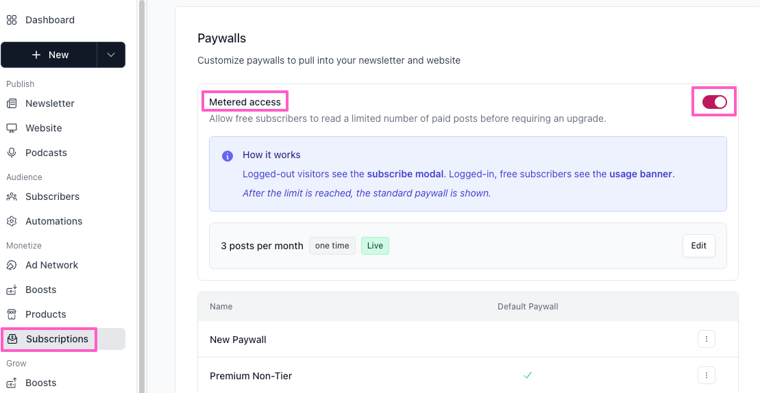 This article covers how to set up metered paywall access, configure the post limit and timeframe, and customize the two reader-facing surfaces: the subscribe modal and the usage banner. For help with standard paywalls, see How to create and apply standard paywalls.