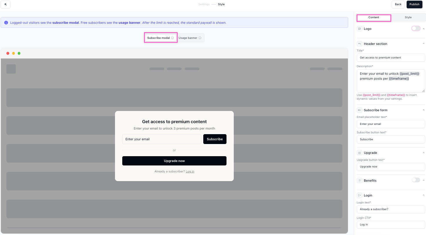 The subscribe modal is the full-screen modal shown to logged-out visitors when they open a paid post. You’ll configure it in the Style settings (step 6 above). Toggle on the Subscribe modal at the top of the preview, and the Content tab settings will open on the left.