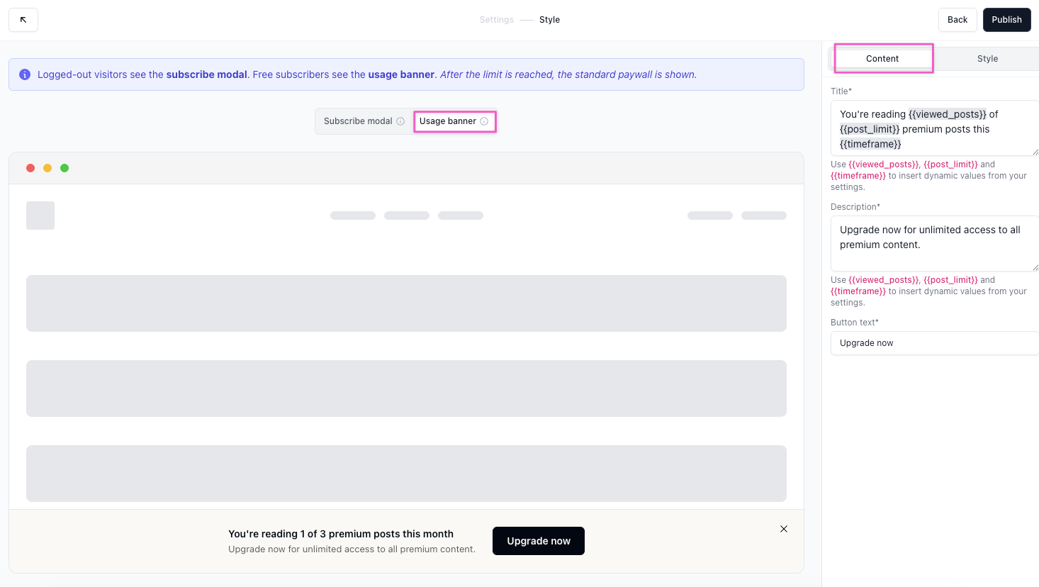 The usage banner is the sticky banner shown at the bottom of paid posts to free subscribers who are still under their limit. Toggle the canvas preview to the Usage banner at the top of the editor to configure it.