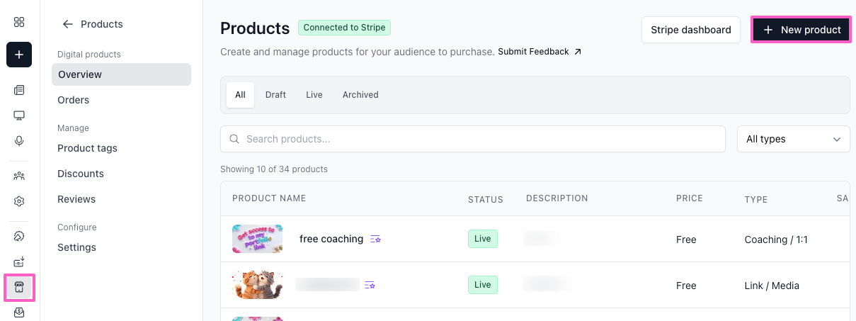 - Your Products Overview will open. Click the + New product button.