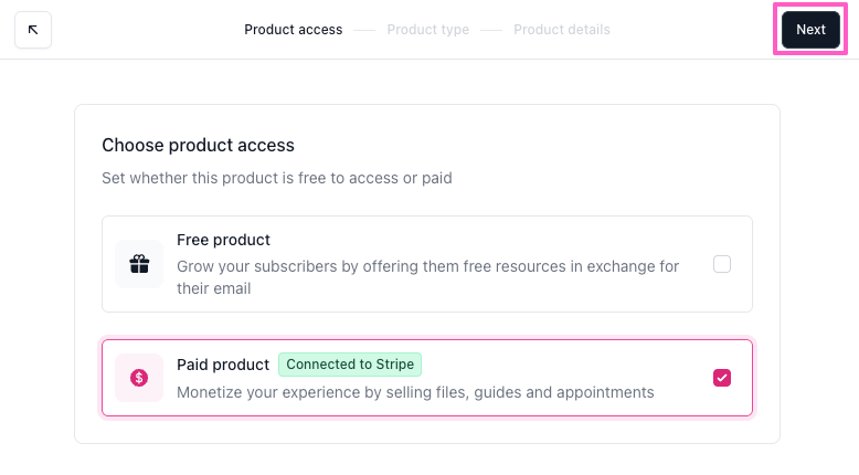 - On the Product access screen, select Paid (or Free) product, then click Next.