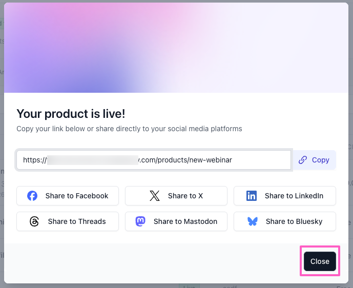 - Upon publishing, you'll receive a confirmation with your product link and options to share it directly to social media. Click Close when done.