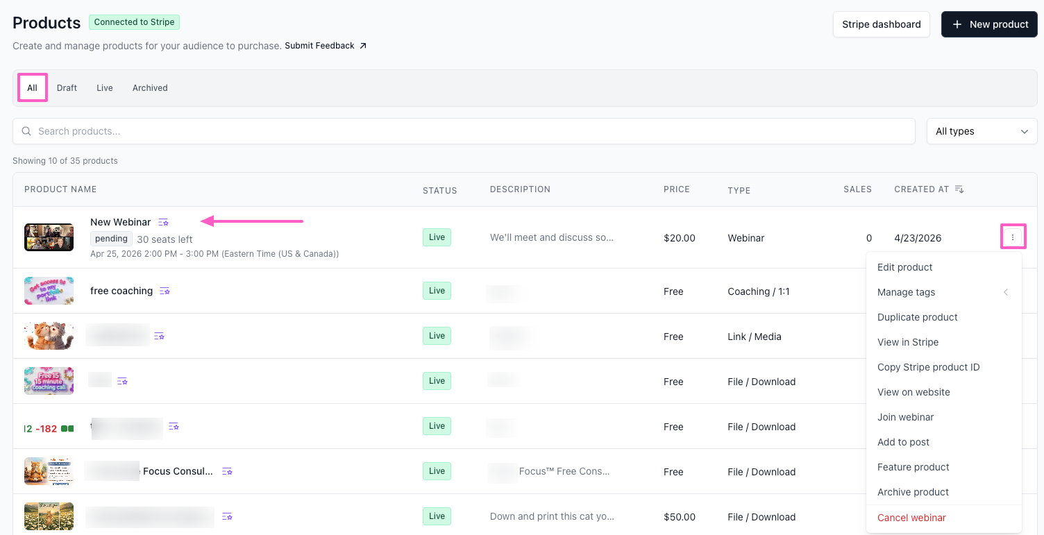 Once your webinar is published or saved as a draft, you can manage it directly from your Products dashboard.