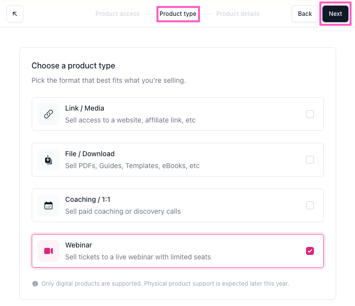 - On the Product type screen, select Webinar, then click Next.