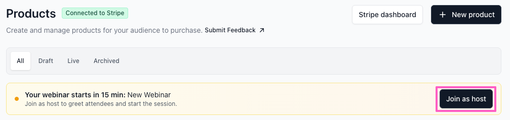 When it's almost time for your event, you'll receive a prompt at the top of your Products dashboard to join as host. Click the Join as host button to open the webinar room.