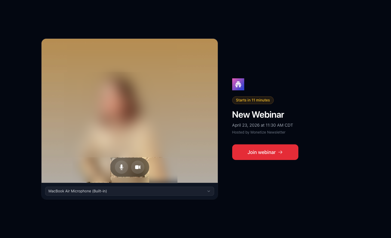 Webinars are a type of digital product that let you host live events for your audience — free or paid — directly from your beehiiv website. Whether you're nurturing leads toward a more premium offering, rewarding paid subscribers with exclusive access, or simply connecting with your audience in real time, webinars give you a flexible one-to-many format that lives alongside your newsletter, website, and other products.