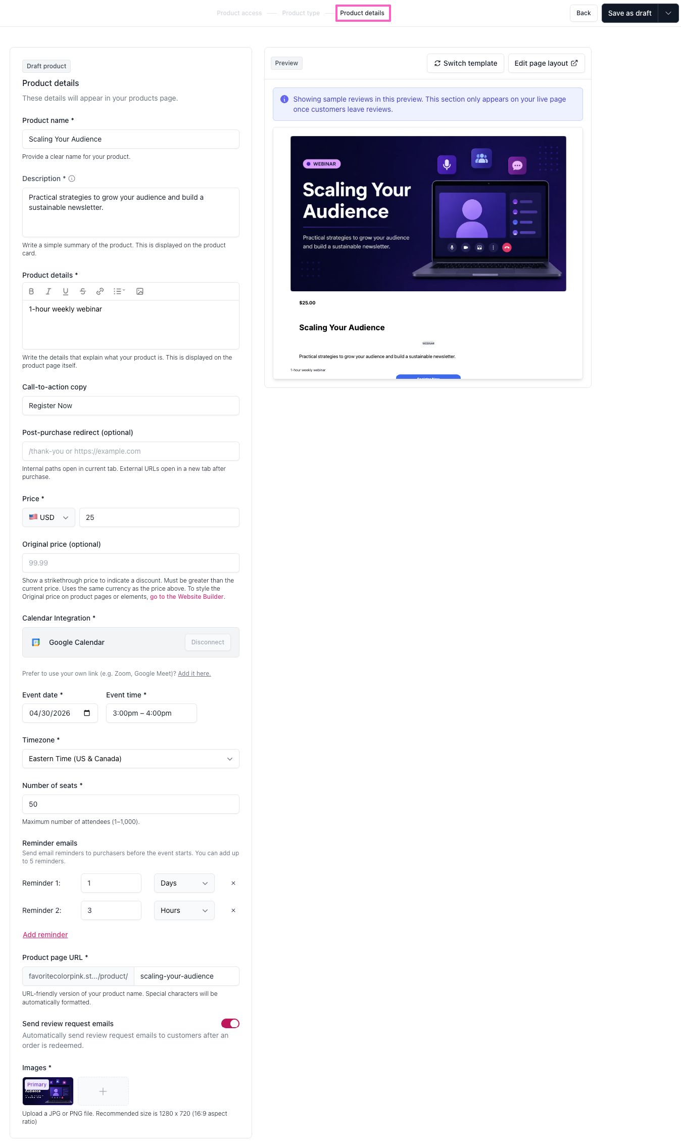 - Product page URL: Customize the unique slug for your webinar page.