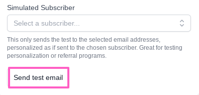 - Simulated Subscriber option: This option sends the test email to your selected test addresses, while displaying the content as if it were sent to a specific subscriber. It’s useful for testing personalization, merge tags, or Referral Program content without emailing the subscriber directly.
