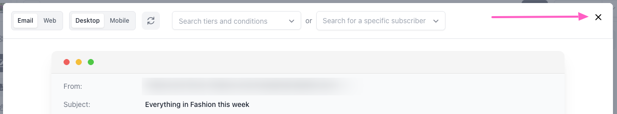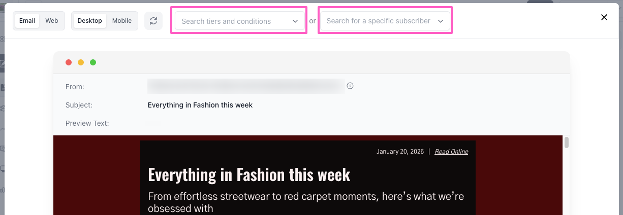 - Search for a specific subscriber: If your post includes merge tags, you can select a subscriber to preview the post exactly as they would see it.