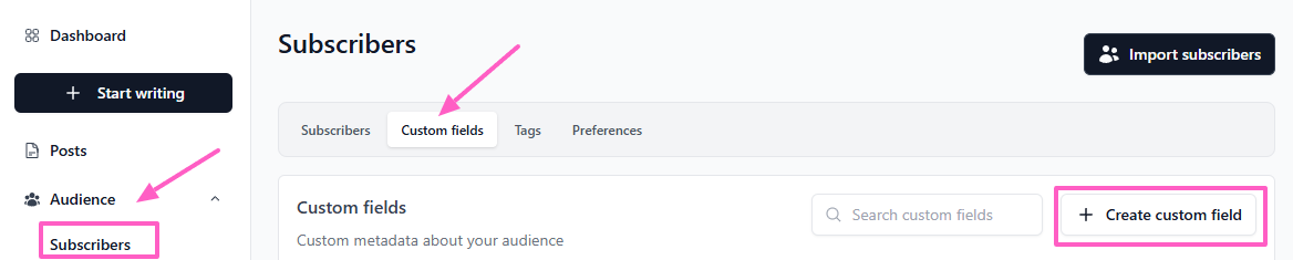 - Your Subscribers dashboard will open on the Subscribers tab, switch over to the Custom Fields tab. To add a new one, click on Create Custom Field.