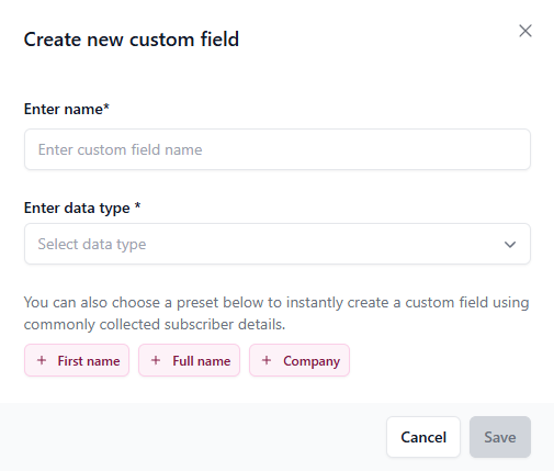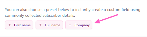 You can also choose a preset option to instantly create a custom field using commonly collected subscriber details like First name, Last name, Full name, or Company.Tech Note: If you use the preset options, your selections will automatically be saved, without the need to click on the Save button. In addition, if you already have a custom field that is a preset option, that option will not be available to you.