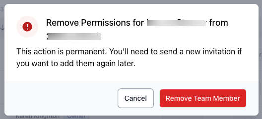 - When you select to remove a team member, a confirmation module will pop up. Click Remove Team Member again to finalize the action.