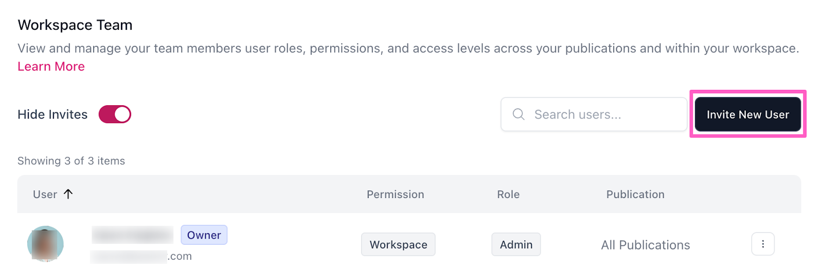Tech Note: When switching a team member between full workspace access to individual publication access, use the edit button to adjust their access level to publication, then select one publication you wish them to have access to.