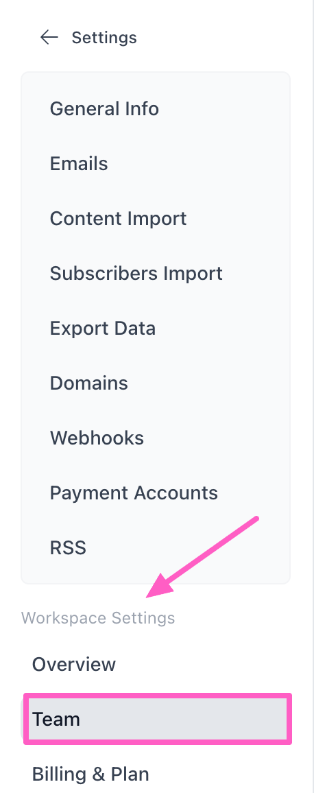 - Your publication settings will open. Scroll down to Workspace Settings in the left panel and click Team.